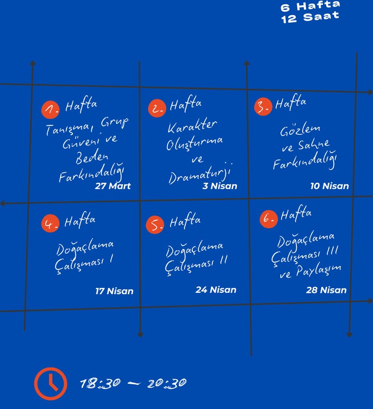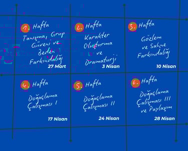 Bu süreç boyunca katılımcılar, gündelik hayattan, gözlemlerinden ve hayal güçlerinden beslenen kısa sahne çalışmaları üretecek ve doğaçlama teknikleriyle yaratıcı anlatım yollarını keşfedecekler.